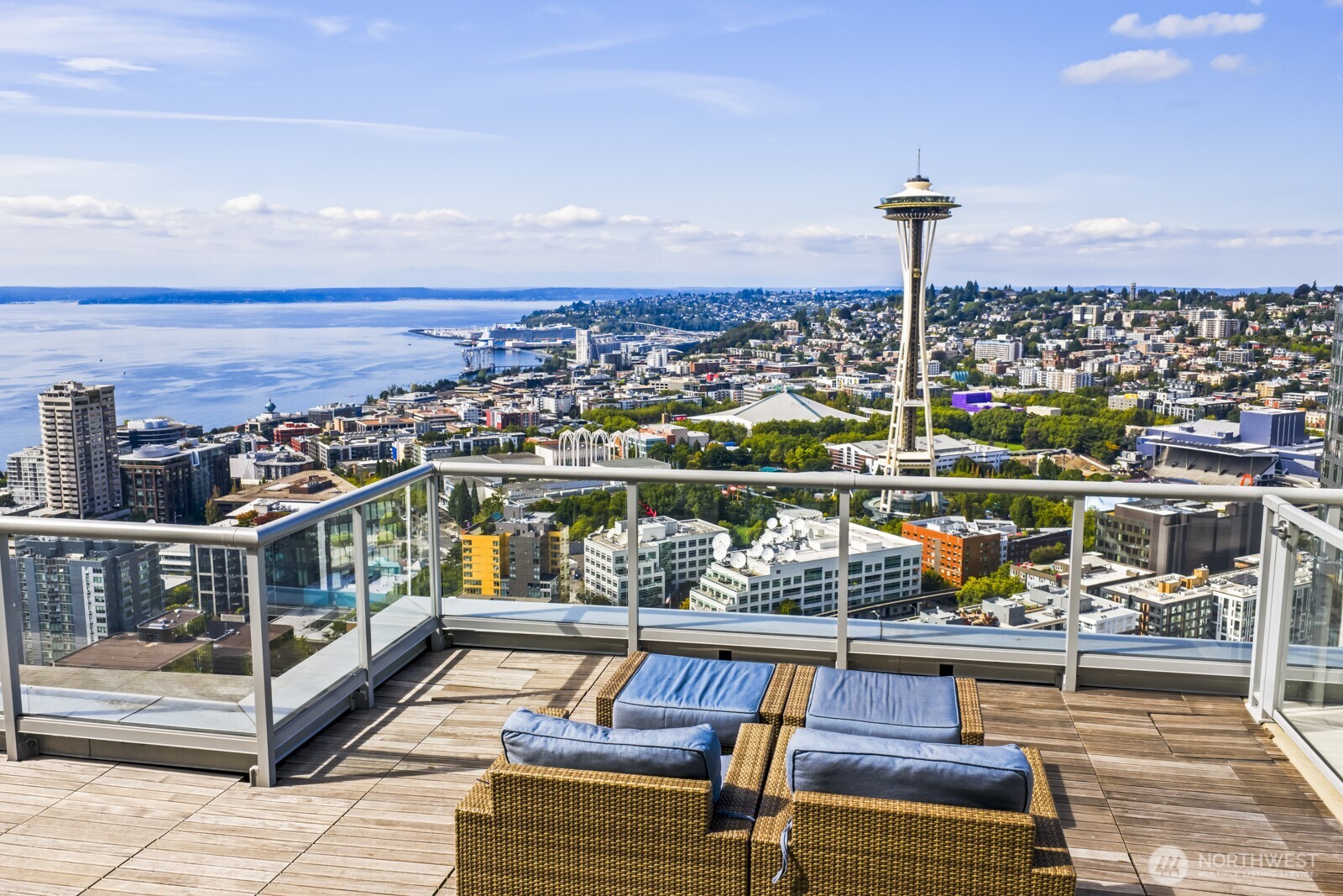 Insignia high-rise condo’s feature two 41 story towers. Luxury amenities include amazing roof top deck and resident lounge, indoor lap pool and sauna, outdoor fireplaces, a screening room and entertaining bar, pet wash and grooming area, secure garage parking, courtyard with fireplace and grilling area, electric car charging stations, bike storage. Designer interiors from Mitchell Freedland. Floor to ceiling windows allow incredible views of the city, sound, mountains, and Lake Union.